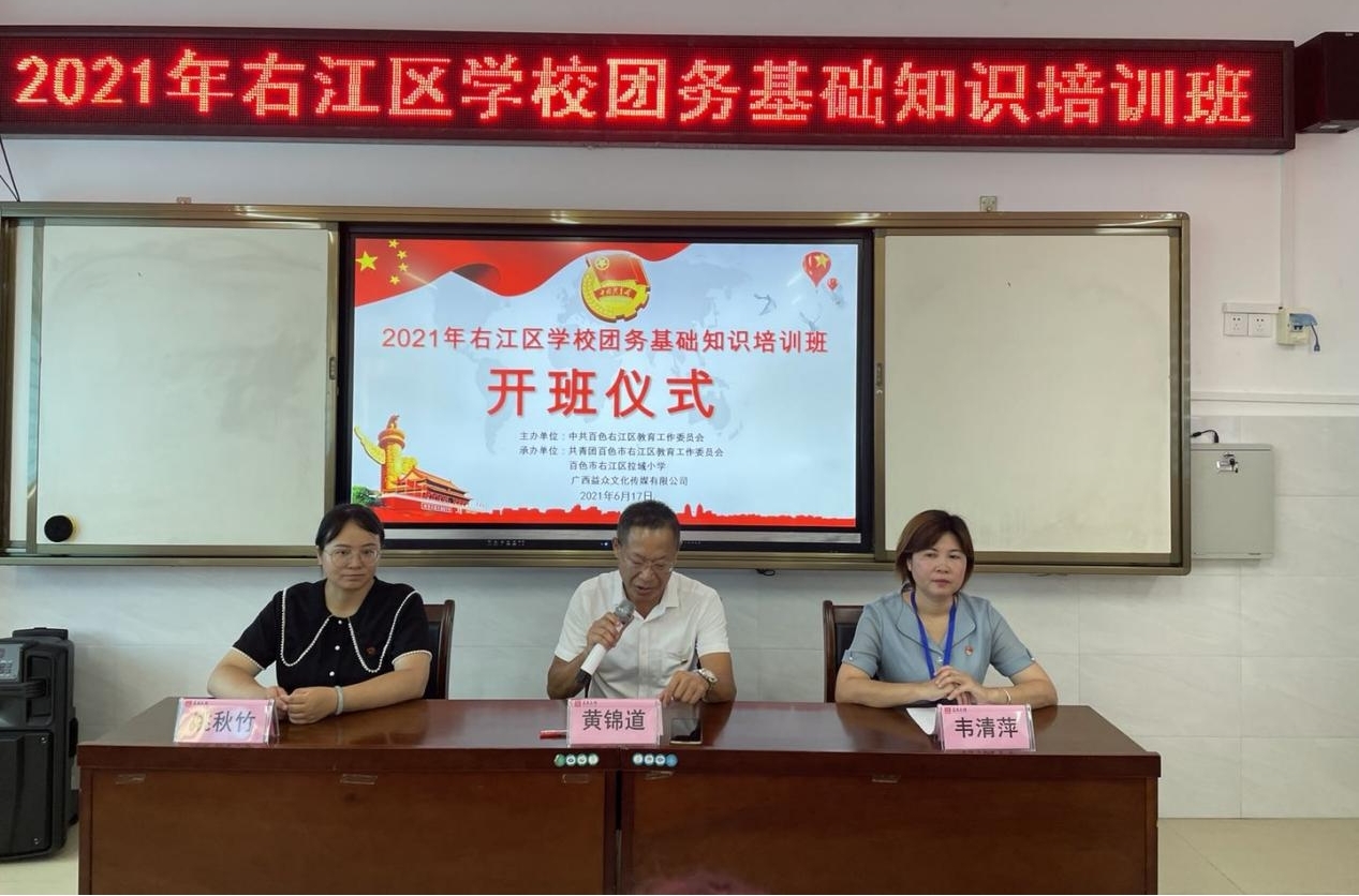 ????????為進一步加強右江區(qū)學校團干隊伍業(yè)務(wù)水平,增強履職盡責能力,全面提升新任團干的業(yè)務(wù)理論、工作技能和創(chuàng)新能力,更好地開展共青團工作,近日,百色市右江區(qū)教育局主辦,百色市右江區(qū)共青團、廣西益眾文化傳媒有限公司、百色市拉域小學聯(lián)合承辦了2021年右江區(qū)學校團務(wù)基礎(chǔ)知識培訓班,來自右江區(qū)37所中小學、幼兒園的團干參加本次培訓。