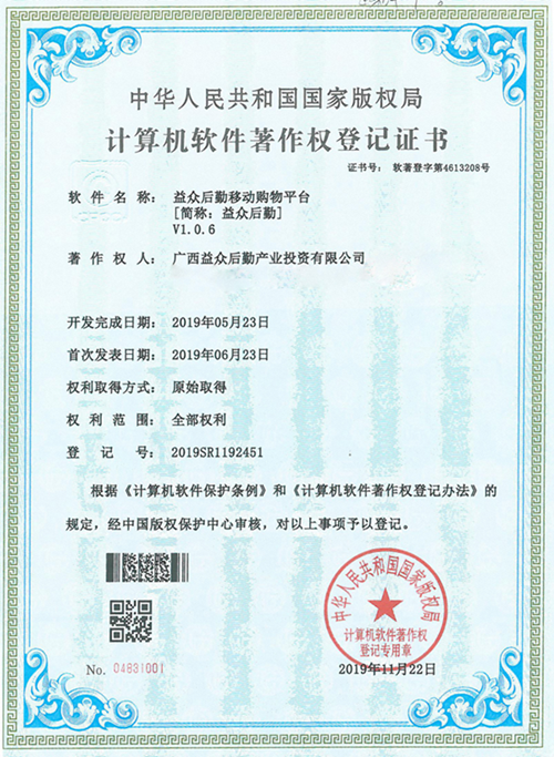 益眾后勤移動(dòng)購(gòu)物平臺(tái)獲國(guó)家版權(quán)局頒發(fā)計(jì)算機(jī)軟件著作權(quán)登記證書