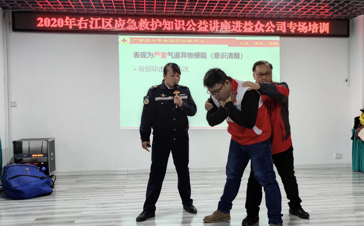 ????????培訓(xùn)由廣西紅十字會(huì)救護(hù)訓(xùn)練中心教務(wù)科長(zhǎng)辛健敏老師主講。在培訓(xùn)中,辛老師介紹了應(yīng)急救護(hù)基本知識(shí)及心肺復(fù)蘇等技能實(shí)踐操作,參訓(xùn)員工們?cè)谂嘤?xùn)人員的指導(dǎo)下認(rèn)真動(dòng)手演練,通過理論和實(shí)操相結(jié)合方式,掌握基本應(yīng)急救護(hù)知識(shí)技能,并就日常生活中遇到的應(yīng)急救護(hù)步驟進(jìn)行解答。