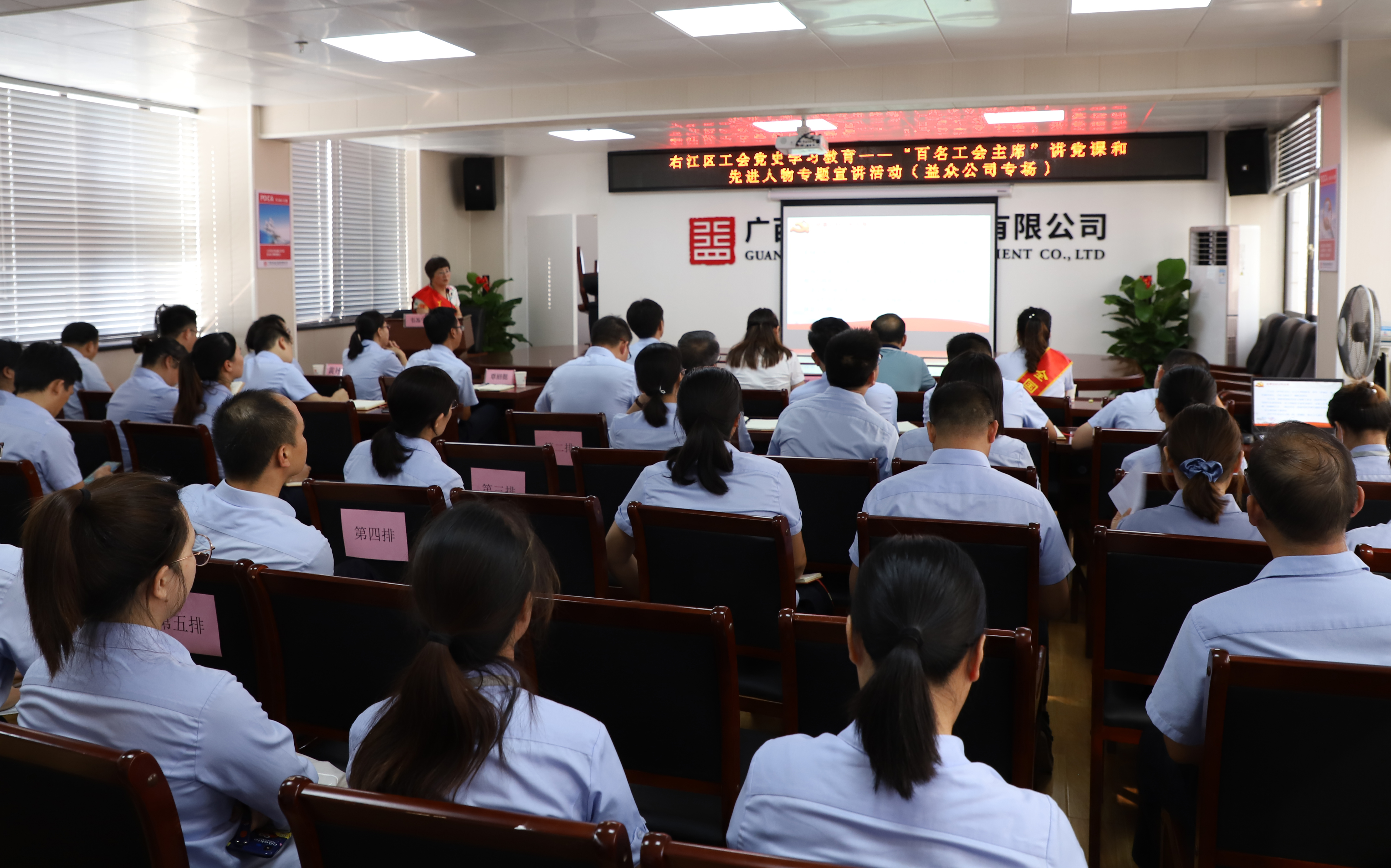 ????????6月18日,百色市工會黨史學(xué)習(xí)教育——“百名工會主席”講黨課和先進(jìn)人物專題宣講活動(益眾公司專場)在益眾公司城北路辦公區(qū)11樓會議室舉行。百色市總工會黨組成員、經(jīng)審會主任黃光日,全國先進(jìn)工作者、全國五一勞動獎?wù)隆叶悇?wù)總局百色市右江區(qū)稅務(wù)局稅源管理股副股長林恒和自治區(qū)先進(jìn)工作者、廣西特級教師、自治區(qū)德育先進(jìn)工作者百色市逸夫小學(xué)校長韋蘇寧分別作黨史黨課、黨史學(xué)習(xí)教育宣講報告,右江區(qū)總工會黨組書記、常務(wù)副主席覃璘清主持會議。益眾公司領(lǐng)導(dǎo)、全體黨員、入黨積極分子、職工代表等約80人參加宣講活動。