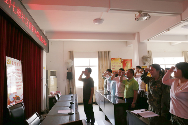 ????????之后,全體黨員重溫《入黨誓詞》?!拔抑驹讣尤胫袊伯a黨,擁護黨的綱領,遵守黨的章程,履行黨員義務,執(zhí)行黨的決定......”,清澈嘹亮的聲音貫穿整個會場,進一步強化了黨員的責任意識。