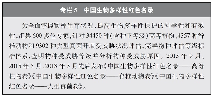 開展全國(guó)生物多樣性調(diào)查與評(píng)估。大力推進(jìn)生物多樣性保護(hù)重大工程實(shí)施,結(jié)合自然資源調(diào)查、生態(tài)系統(tǒng)監(jiān)測(cè)評(píng)估等工作,不斷完善生物多樣性調(diào)查與評(píng)估能力,首次將生物多樣性指標(biāo)納入生態(tài)質(zhì)量綜合評(píng)價(jià)指標(biāo)體系,引導(dǎo)地方加強(qiáng)生態(tài)文明建設(shè)與生物多樣性保護(hù)。開展自然資源調(diào)查,包括森林、草原、水、濕地、荒漠、海洋等,建立自然資源調(diào)查評(píng)價(jià)監(jiān)測(cè)制度。構(gòu)建了涵蓋2376個(gè)縣級(jí)行政單元、樣線總長(zhǎng)超過3.4萬公里的物種分布數(shù)據(jù)庫(kù),建立物種資源調(diào)查及收集信息平臺(tái),準(zhǔn)確反映野生動(dòng)植物空間分布狀況。完成長(zhǎng)江經(jīng)濟(jì)帶、京津冀等國(guó)家戰(zhàn)略區(qū)域180多個(gè)縣級(jí)行政區(qū)生物多樣性調(diào)查與評(píng)估。組織開展近海漁業(yè)資源調(diào)查,初步掌握近海漁業(yè)資源狀況。陸續(xù)發(fā)布《中國(guó)植物紅皮書》《中國(guó)瀕危動(dòng)物紅皮書》《中國(guó)物種紅色名錄》《中國(guó)生物多樣性紅色名錄》,基本掌握生物多樣性總體情況,為加強(qiáng)生物多樣性保護(hù)奠定了科學(xué)基礎(chǔ)。