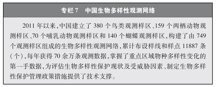 完善監(jiān)測(cè)觀測(cè)網(wǎng)絡(luò)。中國(guó)建立起各類生態(tài)系統(tǒng)、物種的監(jiān)測(cè)觀測(cè)網(wǎng)絡(luò),在生物多樣性理論研究、技術(shù)示范與推廣以及物種與生境保護(hù)方面發(fā)揮了重要作用,為科研、教育、科普、生產(chǎn)等各領(lǐng)域提供了多樣化的信息服務(wù)與決策支持。其中,中國(guó)生態(tài)系統(tǒng)研究網(wǎng)絡(luò)(CERN)、國(guó)家陸地生態(tài)系統(tǒng)定位觀測(cè)研究網(wǎng)絡(luò)(CTERN)涵蓋所有生態(tài)系統(tǒng)和要素,中國(guó)生物多樣性監(jiān)測(cè)與研究網(wǎng)絡(luò)(Sino BON)覆蓋動(dòng)物、植物、微生物等多種生物類群,中國(guó)生物多樣性觀測(cè)網(wǎng)絡(luò)(China BON)構(gòu)建了覆蓋全國(guó)的指示物種類群觀測(cè)樣區(qū)。