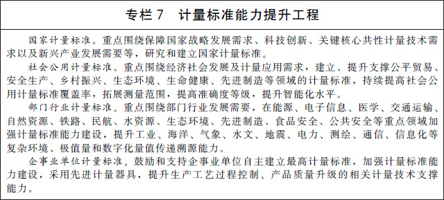 (十九)推進計量標(biāo)準(zhǔn)建設(shè)。改革計量標(biāo)準(zhǔn)體系架構(gòu),統(tǒng)籌考慮技術(shù)能力和現(xiàn)實需求,建立國家計量標(biāo)準(zhǔn)、社會公用計量標(biāo)準(zhǔn)、部門行業(yè)計量標(biāo)準(zhǔn)、企事業(yè)單位計量標(biāo)準(zhǔn)為主體的層次分明、鏈條清晰的計量標(biāo)準(zhǔn)基礎(chǔ)設(shè)施網(wǎng)絡(luò)。實施計量標(biāo)準(zhǔn)能力提升工程,在重點領(lǐng)域新建一批國家計量標(biāo)準(zhǔn),加快推進各級各類計量標(biāo)準(zhǔn)技術(shù)改造和升級換代。建立嵌入式、芯片級、小型化的計量標(biāo)準(zhǔn),推動對制造過程的實時在線測量和最佳控制。