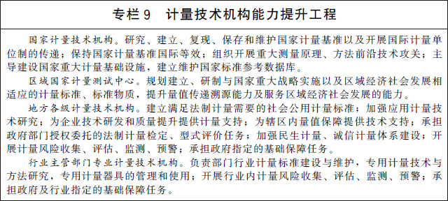 (二十一)加快計量技術(shù)機構(gòu)建設(shè)。深化計量技術(shù)機構(gòu)改革創(chuàng)新發(fā)展,優(yōu)化整合國家計量技術(shù)機構(gòu)、區(qū)域國家計量測試中心、地方各級計量技術(shù)機構(gòu)和行業(yè)主管部門專業(yè)計量技術(shù)機構(gòu)。大力推動國家計量技術(shù)機構(gòu)創(chuàng)新發(fā)展,通過組織開展重大測量原理、方法前沿技術(shù)攻關(guān),建立量子計量基準(zhǔn)并保持國際等效,提供一流的量值溯源和測量服務(wù),支撐國家科技創(chuàng)新、工業(yè)競爭力提升和經(jīng)濟社會發(fā)展。充分發(fā)揮省級人民政府和行業(yè)主管部門計量基礎(chǔ)設(shè)施規(guī)劃建設(shè)自主權(quán),加強普惠性、基礎(chǔ)性和公益性計量基礎(chǔ)設(shè)施建設(shè)。提升計量技術(shù)機構(gòu)服務(wù)市場的能力和水平,推動形成一批專業(yè)領(lǐng)域服務(wù)平臺,培育一批專業(yè)化、社會化、網(wǎng)絡(luò)化的服務(wù)機構(gòu),為經(jīng)濟社會發(fā)展和行業(yè)創(chuàng)新提供計量測試服務(wù)。