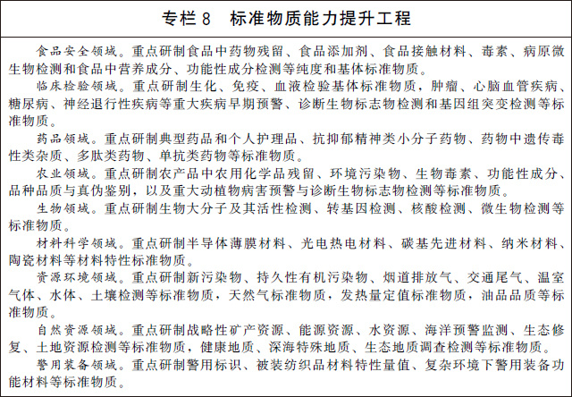 (二十)加大標(biāo)準(zhǔn)物質(zhì)研制應(yīng)用。建立完善以國家基準(zhǔn)物質(zhì)、國家標(biāo)準(zhǔn)物質(zhì)和工作標(biāo)準(zhǔn)物質(zhì)為主要組成部分的標(biāo)準(zhǔn)物質(zhì)體系。實施標(biāo)準(zhǔn)物質(zhì)能力提升工程,加快生命科學(xué)、生物醫(yī)藥、環(huán)境監(jiān)測、食品安全、自然資源、刑事司法等重點領(lǐng)域的標(biāo)準(zhǔn)物質(zhì)研制和應(yīng)用。加強標(biāo)準(zhǔn)物質(zhì)監(jiān)管能力建設(shè)和關(guān)鍵共性技術(shù)研究,提升標(biāo)準(zhǔn)物質(zhì)不確定度水平。探索建立標(biāo)準(zhǔn)物質(zhì)質(zhì)量追溯制度,建設(shè)一批標(biāo)準(zhǔn)物質(zhì)量值核查驗證實驗室,建立標(biāo)準(zhǔn)物質(zhì)質(zhì)量追溯平臺,形成研發(fā)、生產(chǎn)、應(yīng)用全壽命周期的監(jiān)管能力。