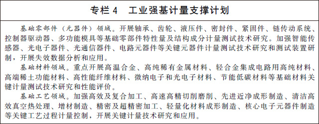 (九)支撐先進制造與質(zhì)量提升。實施制造業(yè)計量能力提升工程,建立一批先進制造業(yè)發(fā)展急需的高準(zhǔn)確度、高穩(wěn)定性計量基準(zhǔn)、標(biāo)準(zhǔn)。在戰(zhàn)略性新興產(chǎn)業(yè)和現(xiàn)代服務(wù)業(yè)等領(lǐng)域,建設(shè)一批國家產(chǎn)業(yè)計量測試中心和聯(lián)盟,搭建計量公共服務(wù)平臺,聚焦制造業(yè)領(lǐng)域測不了、測不全、測不準(zhǔn)難題,加強關(guān)鍵計量測試技術(shù)、測量方法研究和裝備研制,為產(chǎn)業(yè)發(fā)展提供全溯源鏈、全產(chǎn)業(yè)鏈、全壽命周期并具有前瞻性的計量測試服務(wù)。開展產(chǎn)業(yè)計量基礎(chǔ)能力提升行動,實施工業(yè)強基計量支撐計劃,充分發(fā)揮計量對基礎(chǔ)零部件(元器件)、基礎(chǔ)材料、基礎(chǔ)工藝的技術(shù)支撐和保障作用。研究建立國家工業(yè)計量基礎(chǔ)數(shù)據(jù)庫,加強工業(yè)制造領(lǐng)域計量檢定、校準(zhǔn)、測試和檢測數(shù)據(jù)的采集、管理和應(yīng)用。