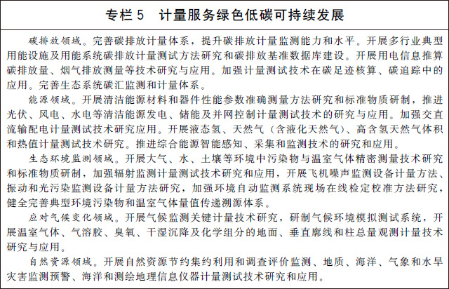 (十四)支撐碳達峰碳中和目標(biāo)實現(xiàn)。完善溫室氣體排放計量監(jiān)測體系,加強碳排放關(guān)鍵計量測試技術(shù)研究和應(yīng)用,健全碳計量標(biāo)準(zhǔn)裝置,為溫室氣體排放可測量、可報告、可核查提供計量支撐。建立碳排放計量審查制度,強化重點排放單位的碳計量要求。在城市和園區(qū)開展低碳計量試點。建立完善資源環(huán)境計量體系,建設(shè)一批國家能源、水文水資源和環(huán)境計量中心,推進能耗、水資源、環(huán)境監(jiān)測系統(tǒng)建設(shè),加強能源資源和環(huán)境計量數(shù)據(jù)分析挖掘和利用。加快推進能源資源計量服務(wù)示范工程建設(shè),引導(dǎo)和培育能源資源和環(huán)境計量服務(wù)市場。
