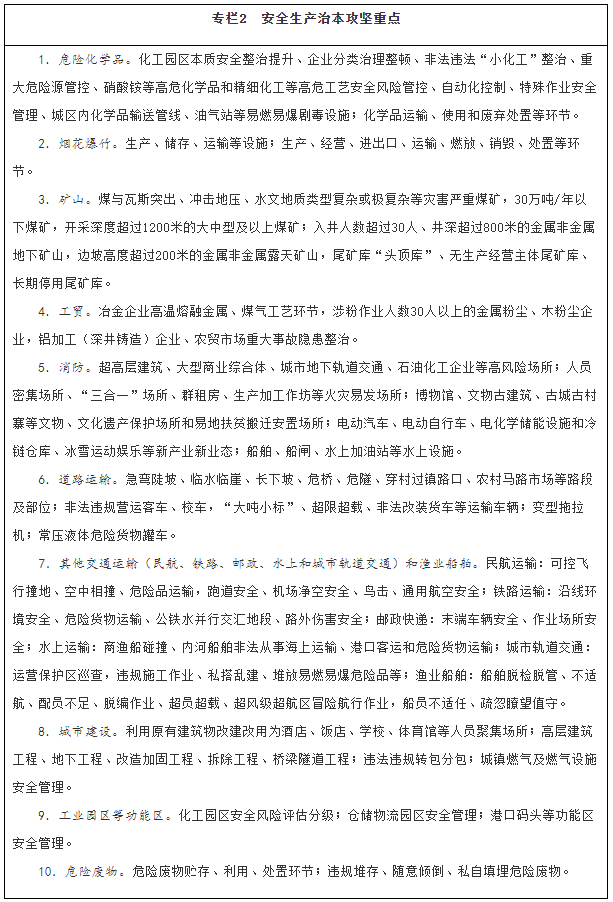 深化專項(xiàng)整治。深入推進(jìn)危險(xiǎn)化學(xué)品、礦山、消防、交通運(yùn)輸、建筑施工、民爆、特種設(shè)備、大型商業(yè)綜合體等重點(diǎn)行業(yè)領(lǐng)域安全整治,解決影響制約安全生產(chǎn)的薄弱環(huán)節(jié)和突出問(wèn)題,督促企業(yè)嚴(yán)格安全管理、加大安全投入、落實(shí)風(fēng)險(xiǎn)管控措施。結(jié)合深化供給側(cè)結(jié)構(gòu)性改革,推動(dòng)安全基礎(chǔ)薄弱、安全保障能力低下且整改后仍不達(dá)標(biāo)的企業(yè)退出市場(chǎng)。統(tǒng)籌考慮危險(xiǎn)化學(xué)品企業(yè)搬遷和項(xiàng)目建設(shè)審批,優(yōu)先保障符合條件企業(yè)的搬遷用地。持續(xù)推進(jìn)企業(yè)安全生產(chǎn)標(biāo)準(zhǔn)化建設(shè),實(shí)現(xiàn)安全管理、操作行為、設(shè)施設(shè)備和作業(yè)環(huán)境規(guī)范化。推動(dòng)淘汰落后技術(shù)、工藝、材料和設(shè)備,加大重點(diǎn)設(shè)施設(shè)備、儀器儀表檢驗(yàn)檢測(cè)力度。推動(dòng)各類金融機(jī)構(gòu)出臺(tái)優(yōu)惠貸款等金融類產(chǎn)品,大力推廣新技術(shù)、新工藝、新材料和新裝備,實(shí)施智能化礦山、智能化工廠、數(shù)字化車間改造,開展智能化作業(yè)和危險(xiǎn)崗位機(jī)器人替代示范。強(qiáng)化危險(xiǎn)廢物全過(guò)程監(jiān)管,動(dòng)態(tài)修訂《國(guó)家危險(xiǎn)廢物名錄》,修訂危險(xiǎn)廢物鑒別、貯存以及水泥窯協(xié)同處置污染控制等標(biāo)準(zhǔn),制定完善危險(xiǎn)廢物重點(diǎn)監(jiān)管單位清單。建立廢棄危險(xiǎn)化學(xué)品等危險(xiǎn)廢物監(jiān)管協(xié)作和聯(lián)合執(zhí)法工作機(jī)制,加強(qiáng)危險(xiǎn)廢物監(jiān)管能力與應(yīng)急處置技術(shù)支持能力建設(shè)。