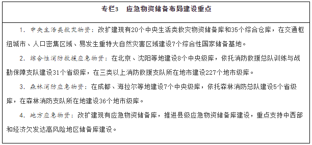 充分利用倉(cāng)儲(chǔ)資源,依托現(xiàn)有中央和地方物資儲(chǔ)備庫(kù),建設(shè)綜合應(yīng)急物資儲(chǔ)備庫(kù)。在交通樞紐城市、人口密集區(qū)域、易發(fā)生重特大自然災(zāi)害區(qū)域建設(shè)一批綜合性國(guó)家儲(chǔ)備基地。建設(shè)完善國(guó)家綜合性消防救援隊(duì)伍應(yīng)急物資儲(chǔ)備庫(kù)及戰(zhàn)勤保障站。在關(guān)鍵物流樞紐建設(shè)應(yīng)急物資調(diào)運(yùn)平臺(tái)和區(qū)域配送中心,依托大型快遞物流企業(yè)建設(shè)一批綜合應(yīng)急物資物流基地。完善國(guó)家應(yīng)急資源管理平臺(tái)和應(yīng)急物資保障數(shù)據(jù)庫(kù),匯聚應(yīng)急物資信息。